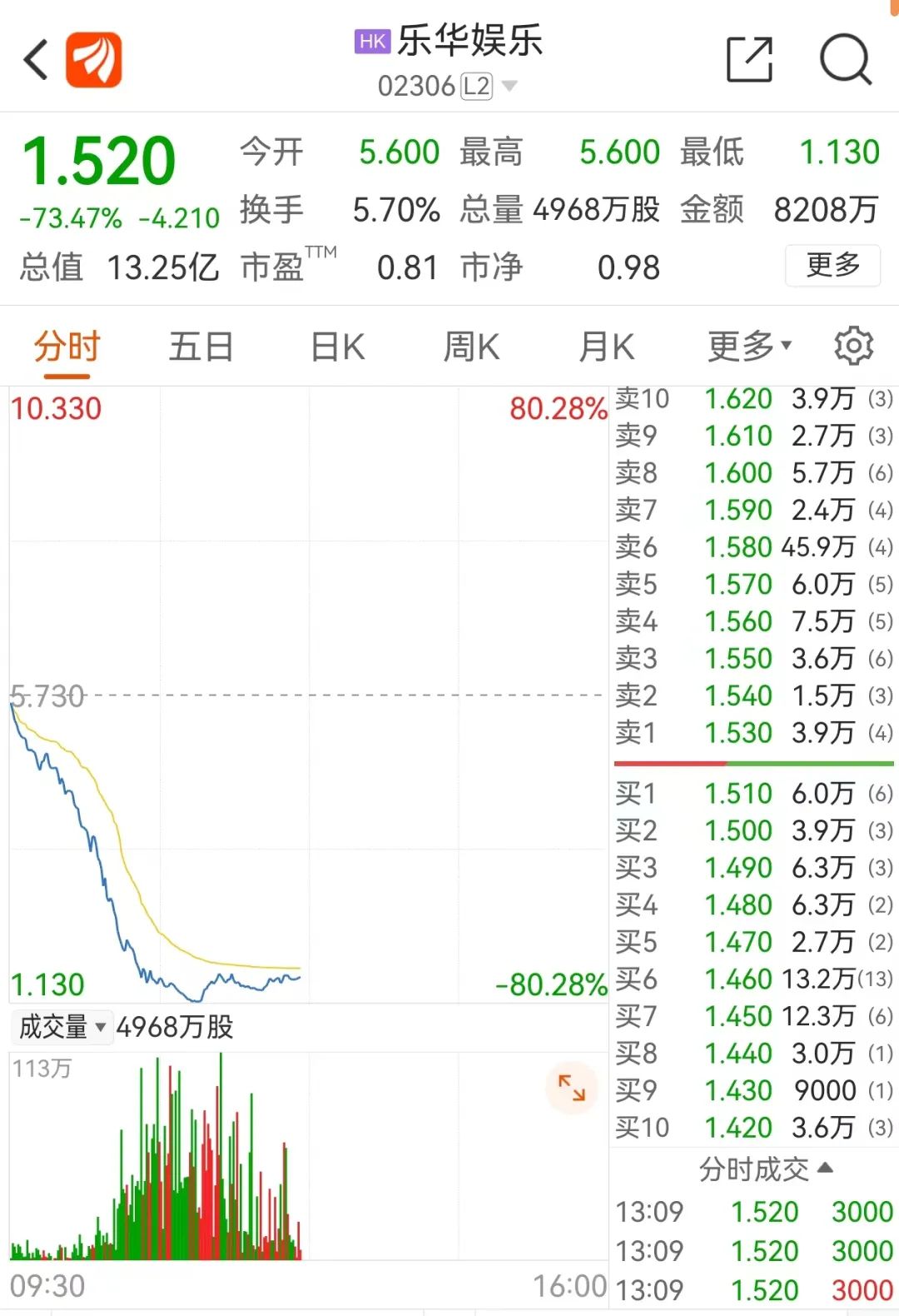似乎又有一家公司被做空了。港股乐华娱乐今天早上跌幅扩大,最大跌幅一度接近80%,创上市以来新低,近3个交易日连续杀跌。截至券商中国发稿,下跌73.47%,报1.52港元/股。
