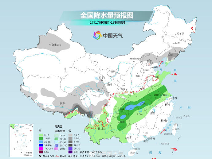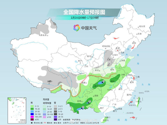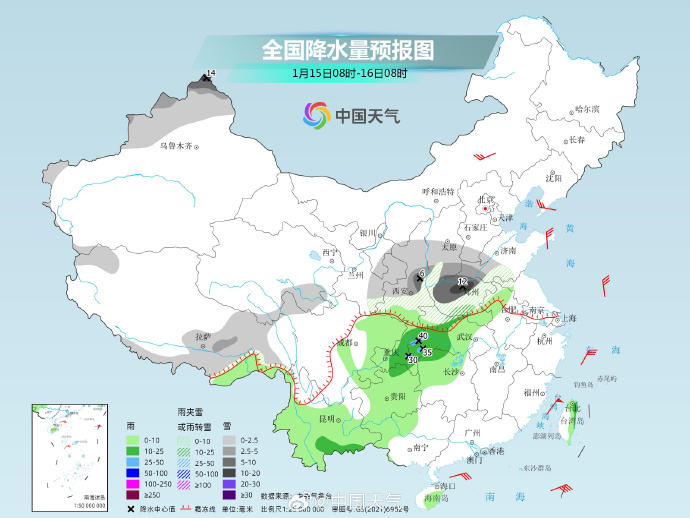据@中国天气消息,15日至19日,随着冷暖气流共同发力,我国将迎2024年来首场大范围雨雪天气。预计西南地区东部、陕西中南部、山西南部、黄淮、江淮、江汉、江南将出现一次较大范围雨雪天气过程,陕西、山西、黄淮及湖北西部等地有雨转雨夹雪或小到中雪、局地大雪;西南地区东部、江汉东部、江淮、江南、华南有小到中雨,其中江汉、江淮、江南北部和西部及贵州等地的部分地区有大雨。
